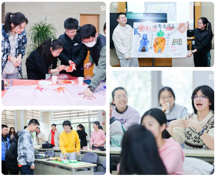 为使同学们能更好地进行后续的学习与合作,在开营结束后还进行了破冰活动。同学们以小组合作的形式进行了听歌识曲、emoji猜词等一系列趣味游戏,并绘制了各队的组旗。通过破冰活动,同学们迅速熟识起来,畅谈起各自的校园经历和寒假规划,交流爱好,分享美食,在这个过程中悄然建立起友谊。
