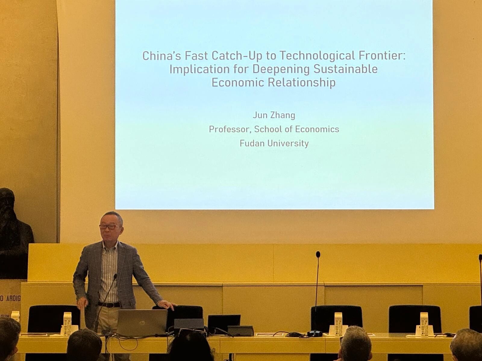 张军院长在签约仪式前应邀发表了题为 《中国向技术前沿的快速追赶及对深化中欧可持续经贸关系的含义》 的主题演讲。演讲中,他结合自身研究成果,讨论了中国超大的市场规模、以理工科为主的人才培养体系以及政府与市场的互动模式等对实现快速科技追赶的贡献,剖析了中国技术进步蕴含的市场机遇及中欧在绿色技术创新、绿色金融及产业投资等领域的合作前景,为现场师生带来了一场兼具深度与前瞻性的学术分享。