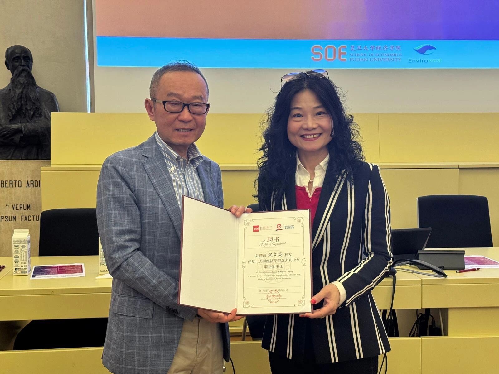 全球校友会意大利联络处挂牌仪式。张军院长代表学院全球校友会向联络处主任宋文英女士颁发聘书。宋文英女士,1991毕业于成人直播