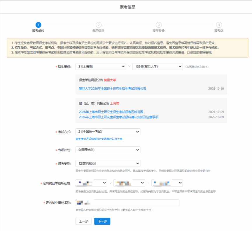 定向就业单位:选择“定向就业”的考生还需填写最近一份工作所在单位信息,报考期间就业单位发生变化不会影响考生报考。