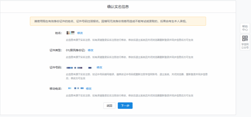 确认实名信息,使用现在有效身份证件的姓名、证件号码注册报名,核对无误后,点击“下一步”。
