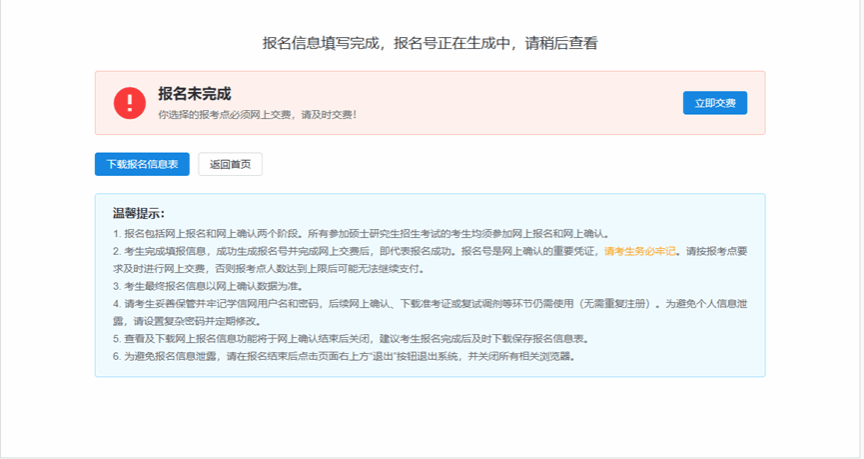 报名信息填写完成之后,一段时间后将会生成报名号,报名号是网上确认的重要凭证,请务必牢记。请按报考点要求及时进行网上交费,否则报考点人数达到上限后可能无法继续支付。