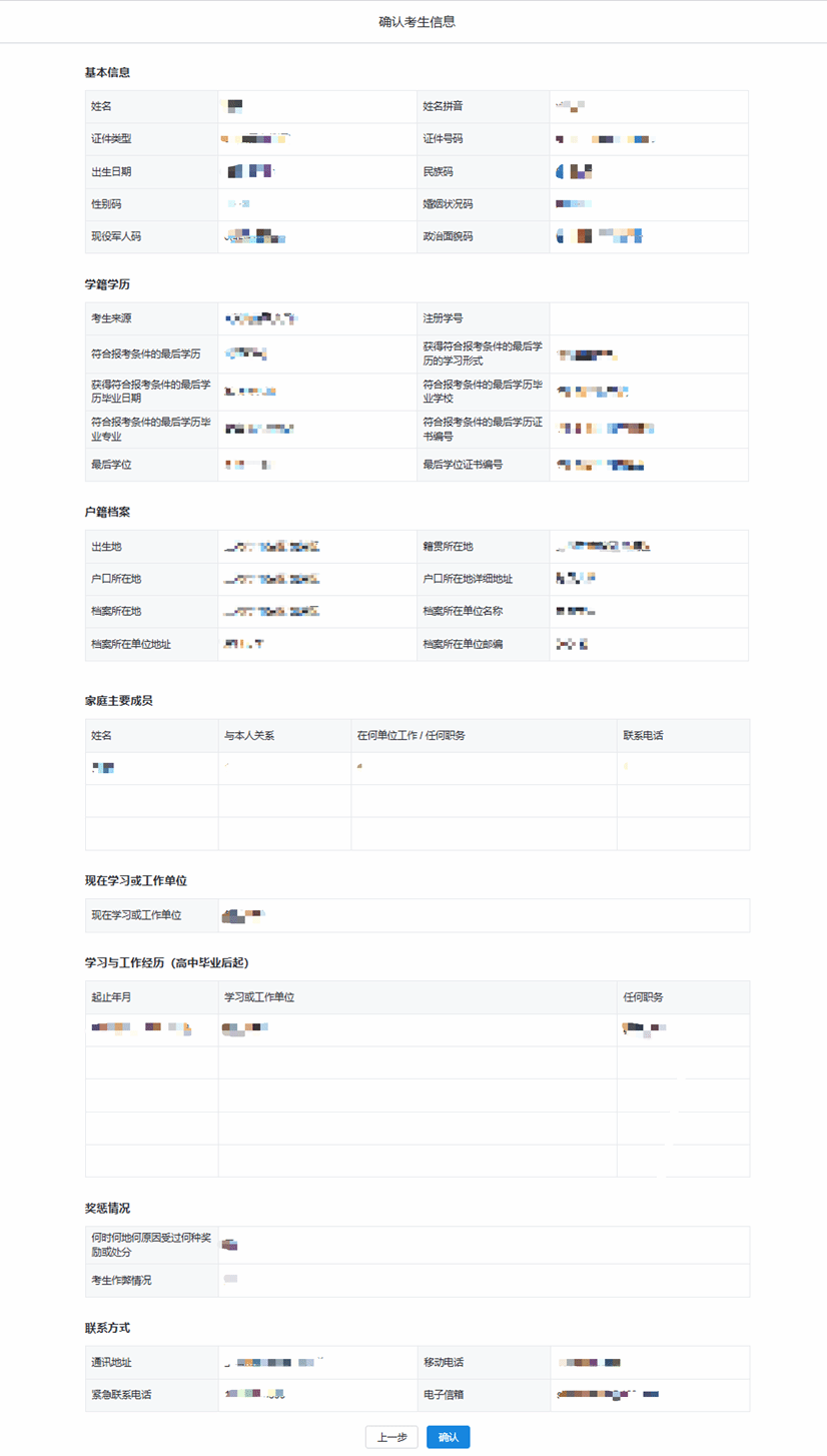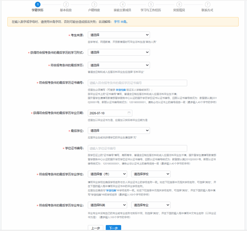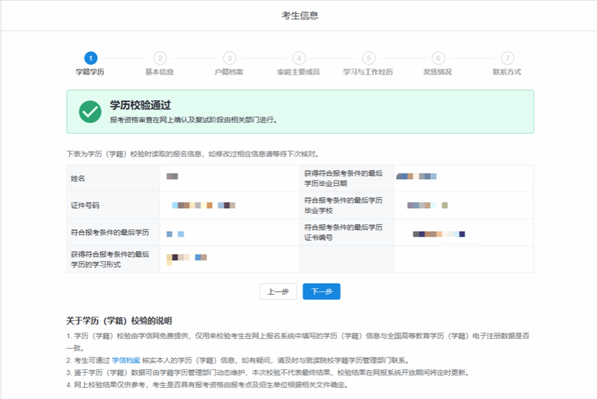 完成学历校验后,按系统提示填写“基本信息→户籍档案→家庭主要成员→学习与工作经历→奖惩情况→联系方式”: