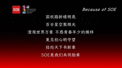 见证了时代前沿的共鸣与争鸣,这一篇章最终在吴尚恒等同学领唱的原创歌曲《Because of SOE》中,回到了全体经院人献礼四十周年院庆的深情告白。随着大屏幕上星云的点亮,时间的指针悄然流转,这场承载着回忆与憧憬的盛会也即将落下帷幕。