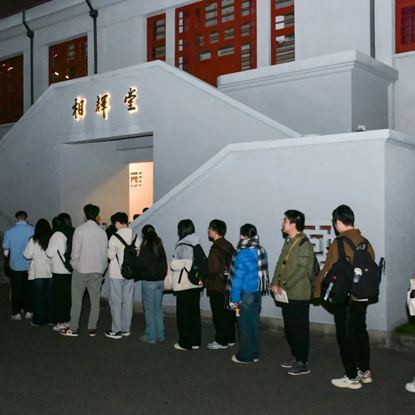乍暖还寒时候,夜长昼短季节,傍晚六点的相辉堂外却是人头攒动。为晚会入场排起的长队,成了夜色中一道独特的风景。观众们在领取门票后,纷纷在文创领取处驻足,对各色精美的院庆周边爱不释手。