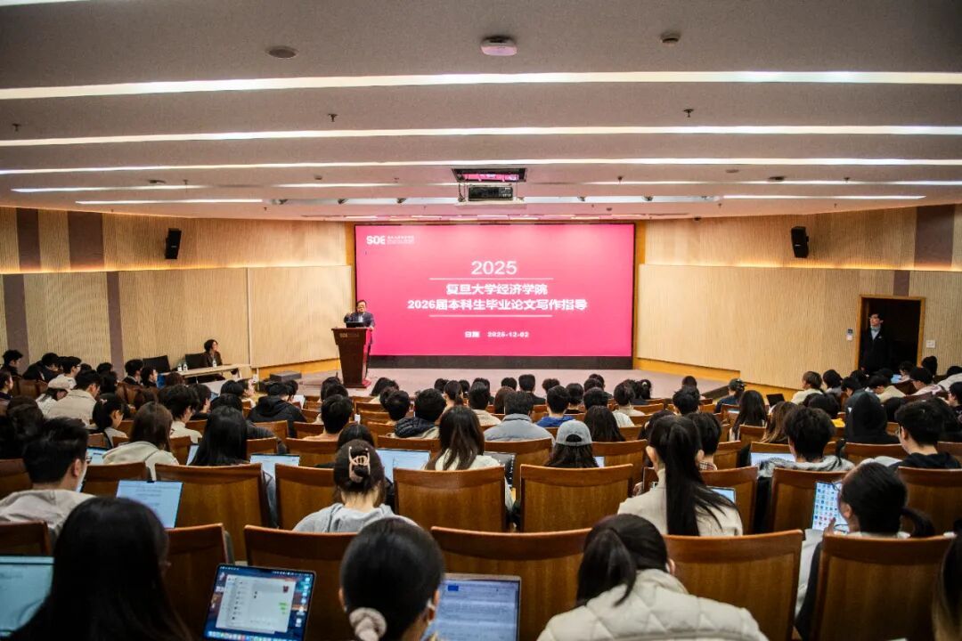 在大金报告厅举办全年级本科毕业论文指导会议。本科教学院长寇宗来教授、本科教务办张毅老师,以及 2025 届优秀毕业生代表徐奕扬、徐杲菡同学先后进行分享,为同学们搭建起从选题构思到定稿归档的全流程指导桥梁。