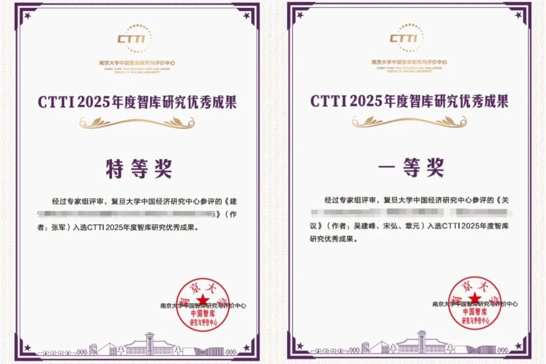 中国经济研究中心参评的《建议将****作为2025年经济工作的核心目标》(作者:张军)荣获CTTI 2025年度智库研究优秀成果特等奖;《关于****的反应和修改建议》(作者:吴建峰、宋弘、章元)荣获CTTI 2025年度智库研究优秀成果一等奖。