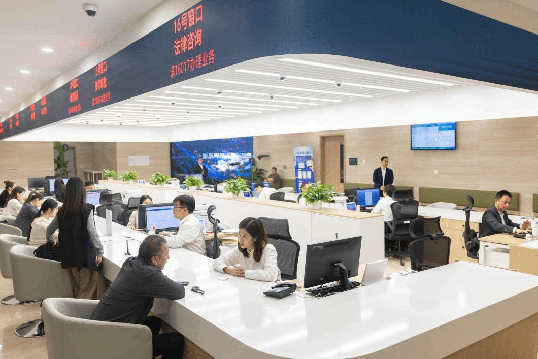 ▲浦东国际法律服务园,企业正在窗口咨询业务。