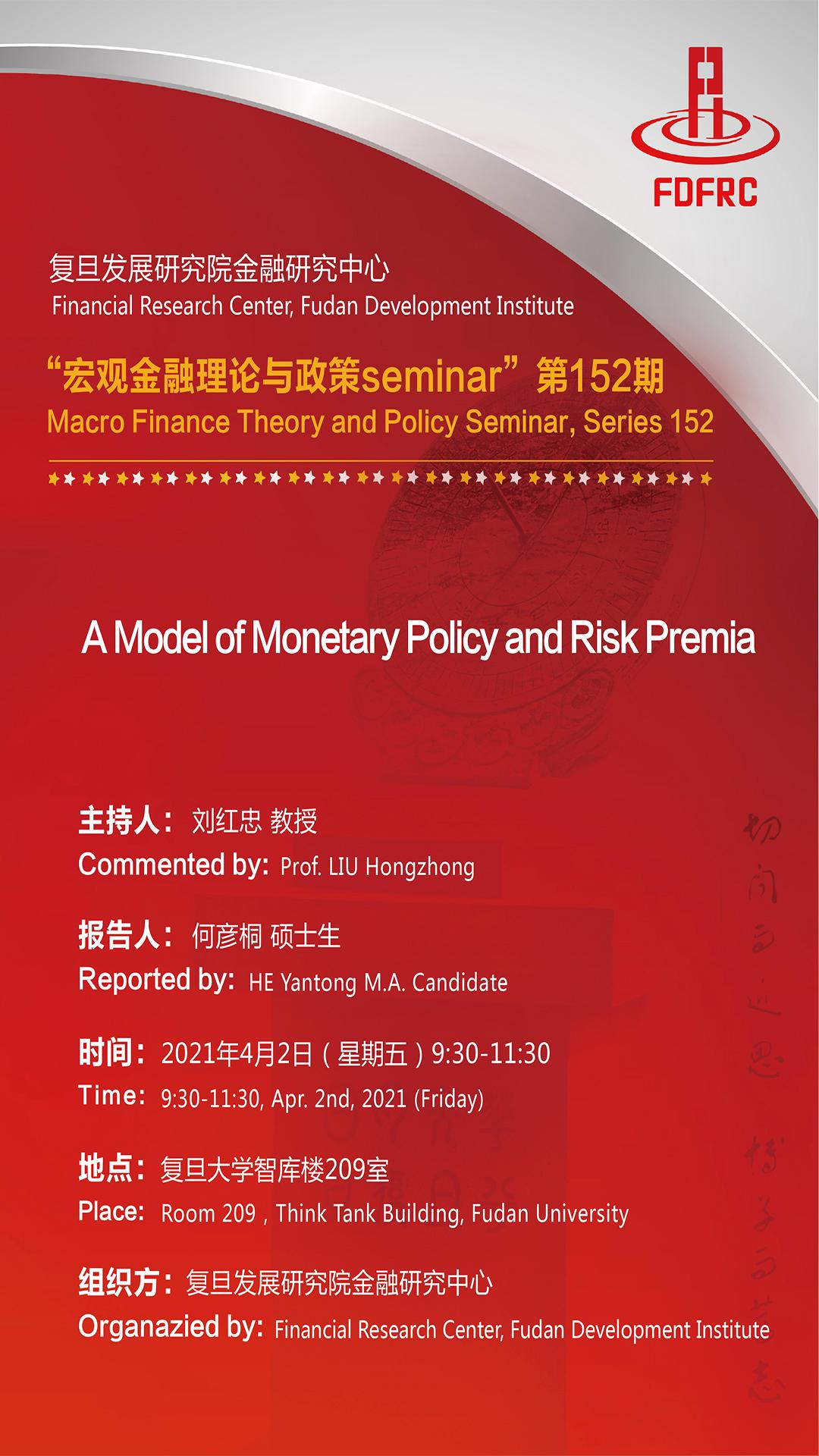 “宏观金融理论与政策seminar”第152期:A Model of Monetary Policy and Risk Premia