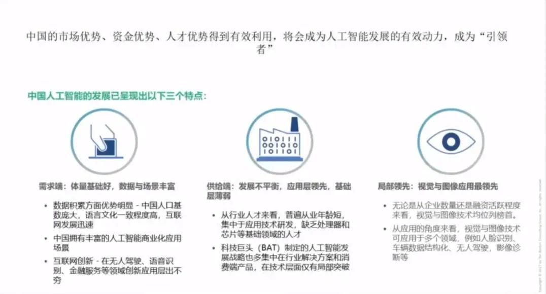 我们也要面向现实,中国发展科技的实际是需求端好、体量大、产品丰富,弱点是供给端的发展不平衡,应用层领先但基础层还是薄弱。但是我们有领先优势,比如计算机视觉、图像、自然语言处理,现在都在赶上。