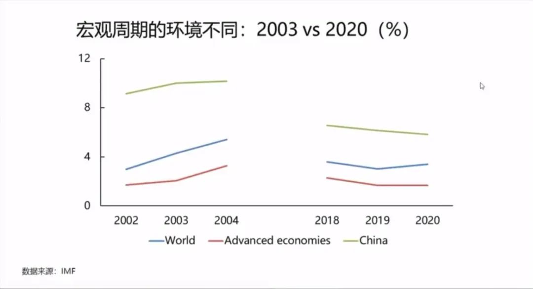 2.2003年处于全球性的上升周期,中国也是在上升周期中。所以,2003年非典期间,中国政府启动政策后能够有一个非常迅速的经济反弹。然而,在今天环境下,这个会变得相对比较困难一些,整个的周期是不一样。
