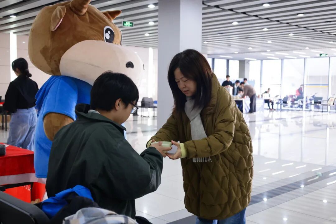 团委的同学们有条不紊地准备着给献血学生的慰问品,在活动开始后为献血学生提供指引。秘书处同学以经小牛的形象出现在现场,以亲切的形象和献血学生拥抱、合影,让同学们心中的紧张情绪烟消云散。