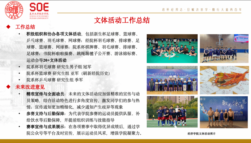 以迎新晚会与赛事组织为载体,增强学院凝聚力。2025年研究生迎新晚会征集节目20余个、主持人10余名,经多轮彩排与周密统筹,吸引近300名师生现场参与,相关推送总阅读量超3500。全年组织、协办各类文体赛事20余项,并在院系杯羽毛球(研究生男子组)、篮球(研究生组)、乒乓球(研究生组)等赛事中取得优异成绩。
