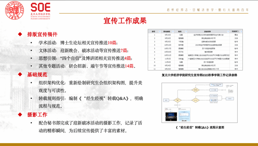 坚持内容生产、规范提升、协同增效三位一体。全年累计发布学术、文体、思想引领等各类推送35篇,优化了研会架构展示,编印《“经生经视”转载Q&A》以明确流程规范。内部管理上,更新排版规范,梳理交付流程与自查清单,引入飞书平台进行文件分类归档,有效提升了资料连续性与团队协作效率。